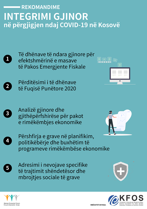 Prioritet duhet të mbetet analiza e thuktë gjinore dhe gjithëpërfshirëse në pakot e rimëkëmbjes ekonomike në Kosovë. Në mënyrë që ato të jenë efektive dhe eficiente për nevojat e grave, planifikimi, politikëbërja dhe buxhetimi i rimëkëmbjes duhet të kenë integrim gjinor. Barrierat e grave në tregun e punës, mbrojtja e vobektë sociale për gratë në fuqinë punëtore, duhet të adresohen me prioritet në mënyrë që hendeku i thellë ekzistues gjinor në dëm të grave të mos rritet si pasojë e pandemisë.