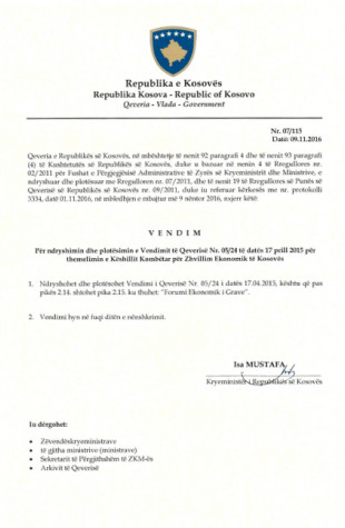 Ndryshohet dhe plotesohët Vendimi i Qeverisë r. 05/24 i dates 17.04.2015, kështu që pas pikës 2.14. shtohet pika 2.15. ku thuhet: "Forumi Ekonomik i Grave".